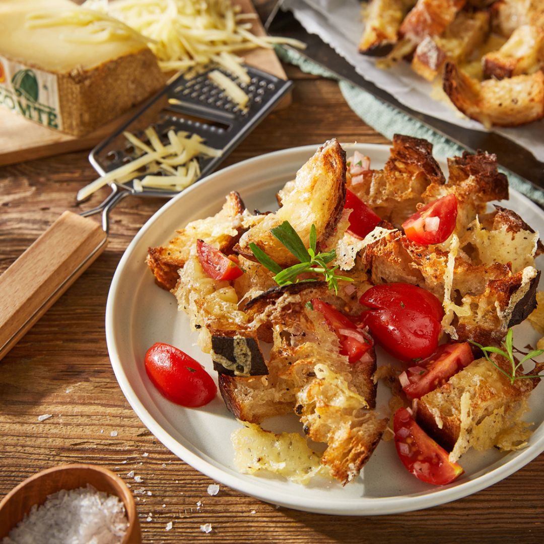 Im vorgeheizten Ofen (E-Herd: 220 °C / Umluft: 200 °C) ca. 8 Minuten rösten. Inzwischen COMTÉ grob reiben, Brot herausnehmen, mit Käse bestreuen und weitere ca. 3 Minuten überbacken. Überbackenes Brot und Salat auf Tellern anrichten und mit Estragon garnieren.